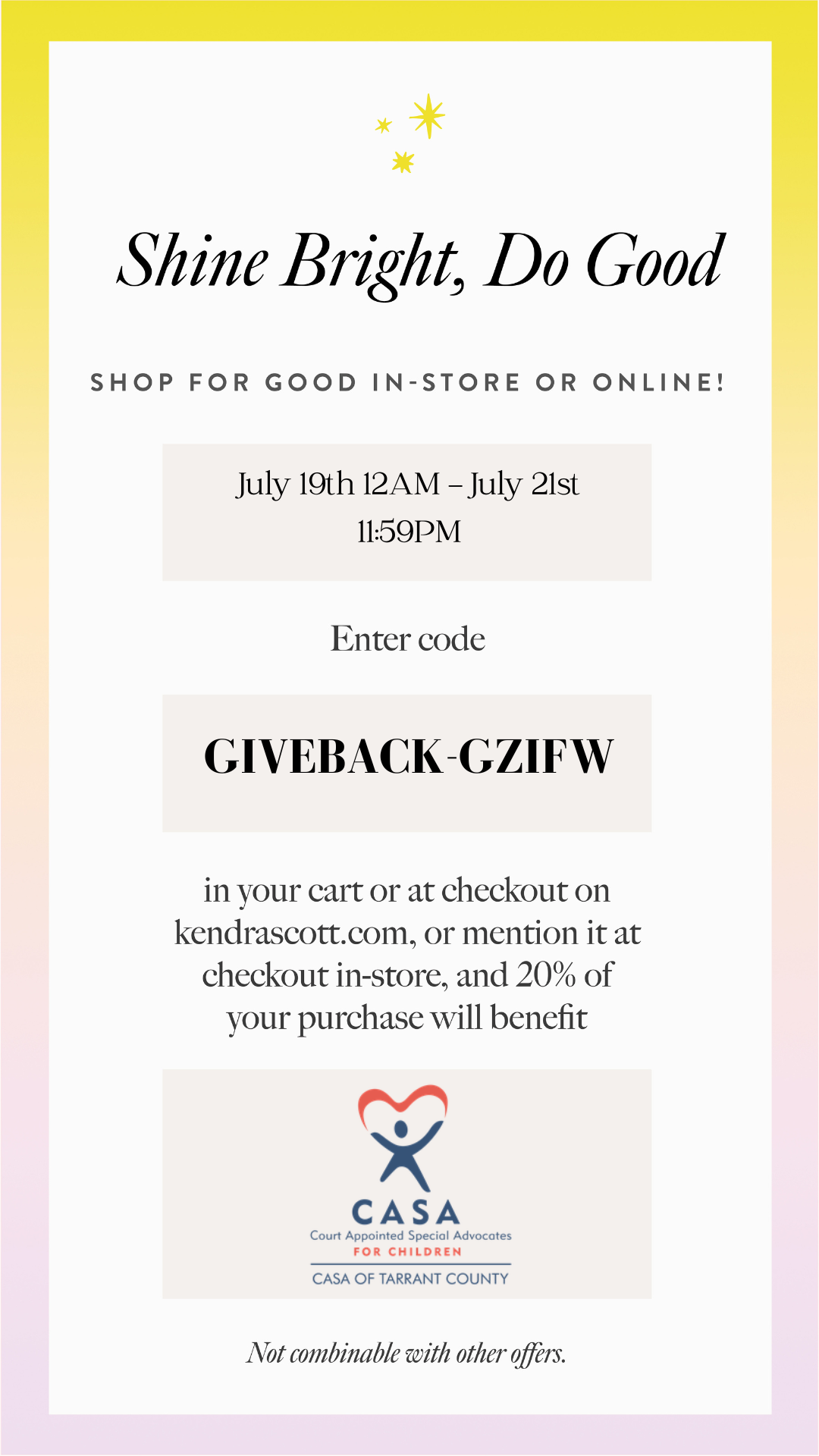 20% of all purchases will go back to CASA of Tarrant County! Can't make it on the 25th? That's alright, shop online and use code GIVEBACK-HBHDC at kendrascott.com (Aug 25-26)