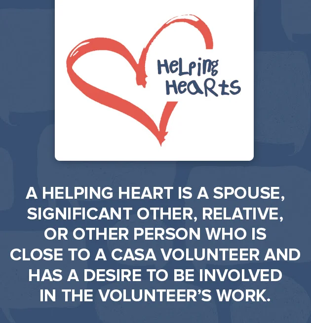 Training over what a "Helping Heart" does and the role they play with CASA volunteers, goes over requirements and process to be eligible.