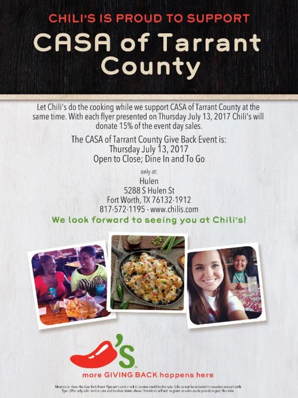 Let Chili's do the cooking and support the CASA of Tarrant County Wing Society at the same time! With each flyer presented on Thursday, July 13, 2017 Chili's will donate 15% of the event day sales. The CASA of Tarrant County Wing Society Give Back Event is: