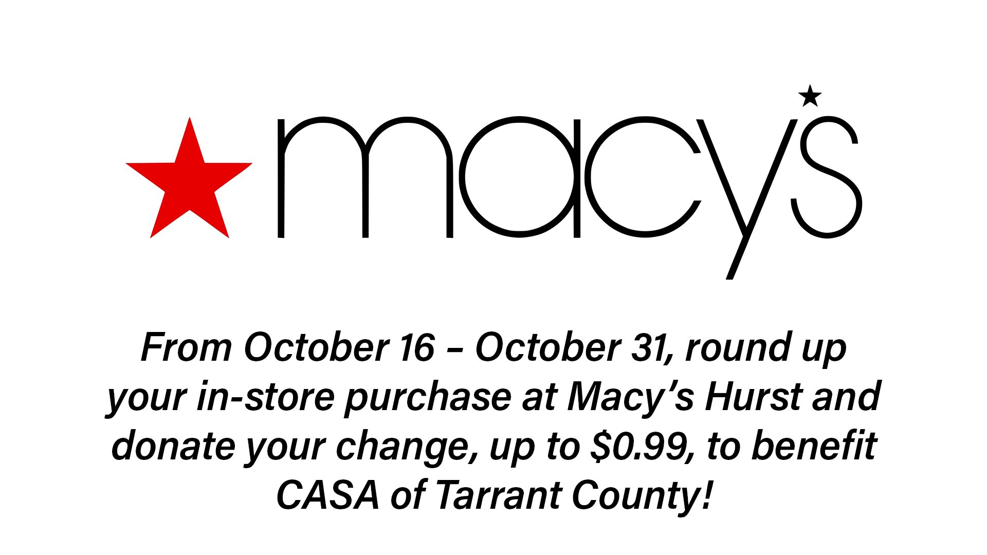 From October 16 – October 31, round up your in-store purchase and donate your change, up to $0.99, to benefit a charity chosen by your local Macy’s. Macy’s Hurst will be inviting their customers to round-up their purchases to the nearest dollar and donate their change, (up to $0.99), to benefit CASA of Tarrant County.