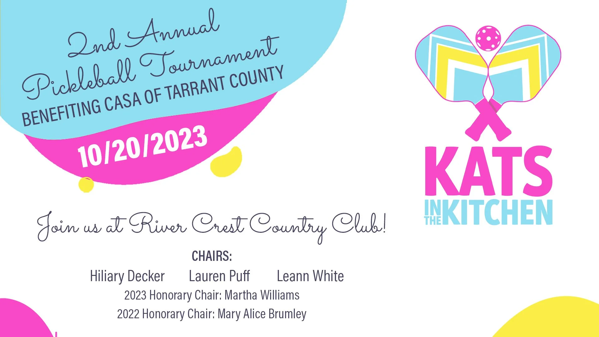 Join us for the second annual 2023 KATS in the Kitchen Pickleball Tournament benefiting CASA of Tarrant County! This event is hosted by the Kappa Alpha Theta Fort Worth Foundation, Inc. and Alumnae. It will be a fun day of pickleball, dinner and drinks! This event will take place at River Crest Country Club beginning at 1:00pm and will include a women’s, men’s and mixed doubles divisions. Snacks, dinner and drinks will also be provided. Player spots are limited, so sign up today!