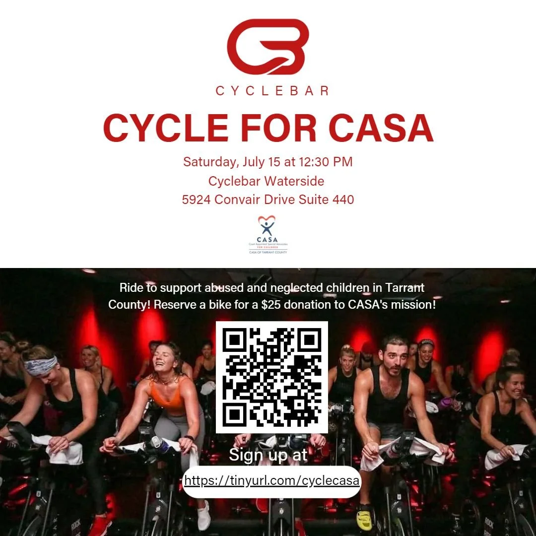 Cycle for CASA at CycleBar Waterside on July 15th at 12:30pm. Participate in this 45-minute charity ride to support abused and neglected children in Tarrant County! All riders will receive the royal CycleBar treatment, including all amenities (complimentary cycling shoes, towels, water, fresh fruit, etc.).